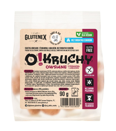 SKŁADNIKIpłatki OWSIANE bezglutenowe (37,7 %), substancja słodząca: maltitol; olej rzepakowy, skrobia kukurydziana, mąka ryżowa, margaryna [oleje i tłuszcze roślinne (olej rzepakowy, całkowicie uwodorniony olej rzepakowy), emulgatory: mono- i diglicerydy kwasów tłuszczowych, estry kwasów tłuszczowych i poliglicerolu; sól, regulator kwasowości: kwas cytrynowy; aromat], żurawina suszona (2,5 %), jabłko suszone (2,3 %), proszek do pieczenia bezglutenowy (regulator kwasowości: difosforany, substancja spulchniająca: węglany sodu; skrobia ziemniaczana, skrobia kukurydziana), substancja zageszczająca: hydroksypropylometyloceluloza, aromat.
