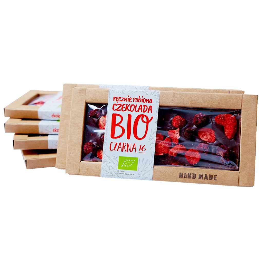 • Ręcznie robiona czekolada deserowa z liofilizowanymi truskawkami i jeżynami, idealna na słodką przekąskę.