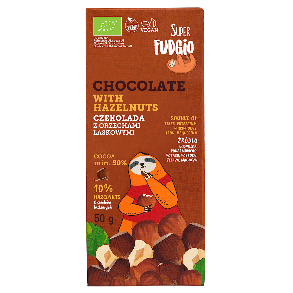 - Bezglutenowa czekolada 90% z orzechami laskowymi, wegańska, ekologiczna, źródło błonnika, 50 g.