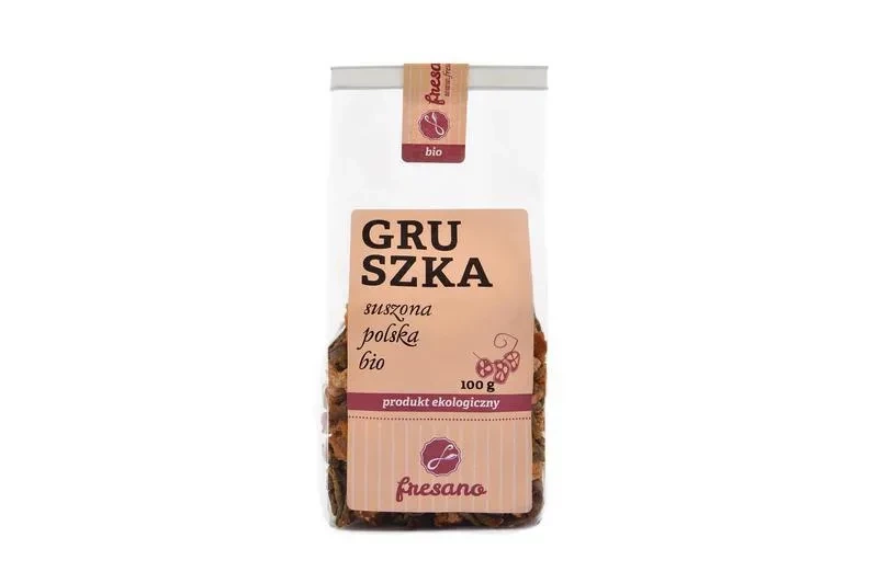- Gruszka suszona z polskich upraw, certyfikowana jako bio, w opakowaniu 100 g. Doskonała jako zdrowa przekąska.