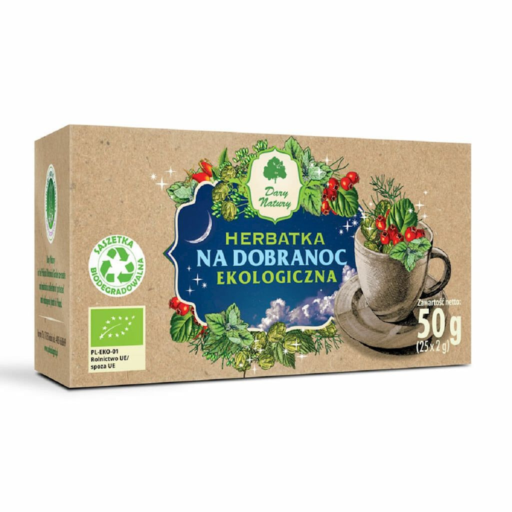 - Herbatka na dobranoc BIO z melisą i lawendą, wspiera relaks i spokojny sen. Idealna na wieczór.
