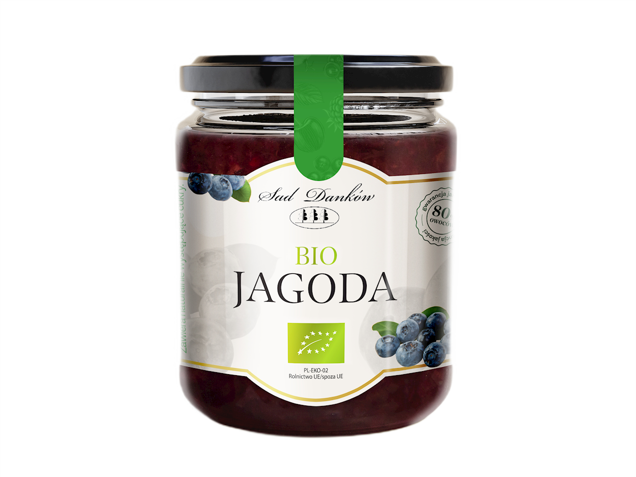 - Ekologiczny dżem jagodowy 80% z jabłkiem, naturalny smak, idealny do deserów i kanapek. Pasteryzowany, bez dodatków.