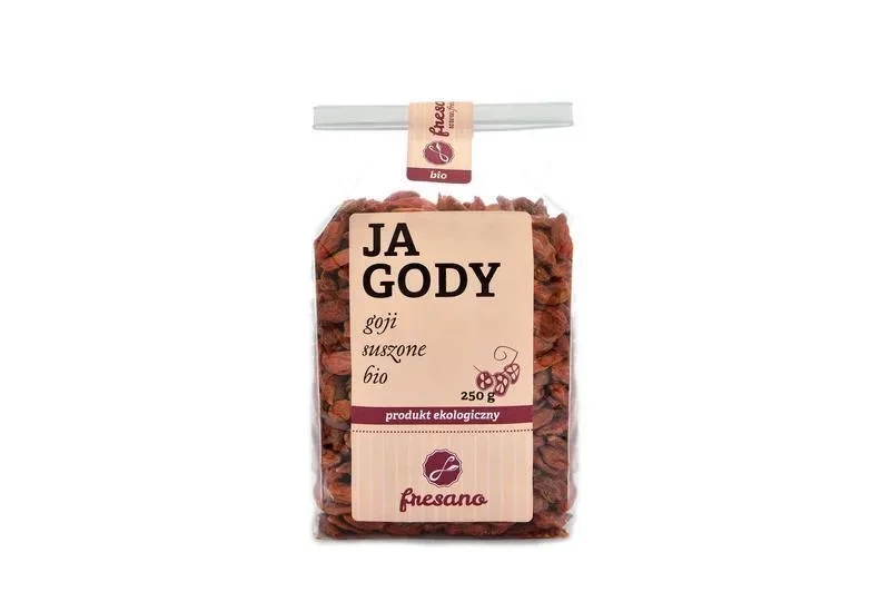 JAGODY GOJI SUSZONE BIO (250 g) marki FRESANO to wysokiej jakości suszone jagody goji pochodzące z certyfikowanych upraw ekologicznych. Jagody goji są bogatym źródłem składników odżywczych, takich jak witaminy, minerały i przeciwutleniacze, które wspierają zdrowie i dobre samopoczucie. Te suszone jagody goji są starannie wyselekcjonowane, suszone naturalnie i nie zawierają żadnych sztucznych dodatków ani konserwantów. Dzięki swojemu intensywnemu smakowi i chrupiącej konsystencji mogą być doskonałym dodatkiem do musli, jogurtów, sałatek czy deserów. JAGODY GOJI SUSZONE BIO (250 g) od FRESANO to doskonały wybór dla osób ceniących sobie naturalne i ekologiczne produkty, które dbają o zdrowie i dobre samopoczucie.Marka