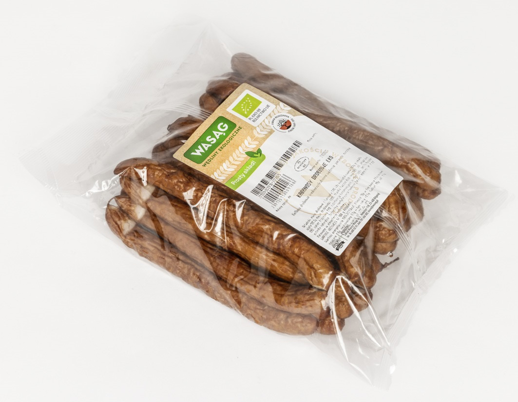 Kiełbaski grubo rozdrobnione, wędzone, pieczone, suszone, produkowane z mięsa drobiowego z dodatkiem naturalnych przypraw.