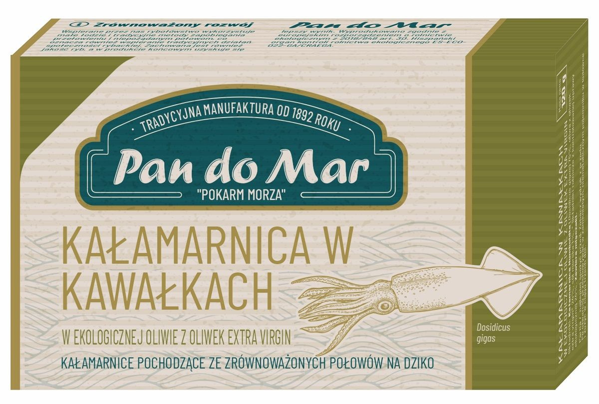 - Kałamarnica Humboldta w bio oliwie z oliwek, idealna na przystawkę. Ekologiczne składniki, tradycyjny połów.