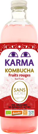 Kombucha* [woda, cukier trzcinowy jasny* (przekształcony w procesie fermentacji), herbata zielona*, herbata czarna*, kultury kombuchy*], czerwone owoce* 2 % (przecier z czarnej porzeczki*, przecier z malin*, przecier z truskawek*), napar z hibiskusa* (woda, kwiaty hibiskusa*), napar z liści stewii* (woda, liście stewii*), naturalny aromat malinowo-truskawkowy*, żywe kultury fermentacyjne, dwutlenek węgla powstały w procesie fermentacji. (*certyfikowany składnik ekologiczny). 97 % składników pochodzących z upraw Fair Trade i rolnictwa biodynamicznego Demeter.