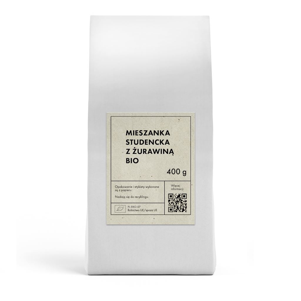 - Ekologiczna mieszanka studencka z żurawiną, idealna jako zdrowa przekąska lub dodatek do wypieków.