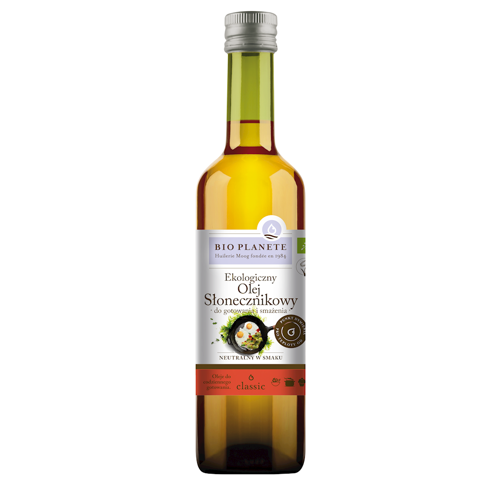 - Ekologiczny olej słonecznikowy BIO, idealny do smażenia i pieczenia, odporny na wysokie temperatury, bogaty w witaminę E.