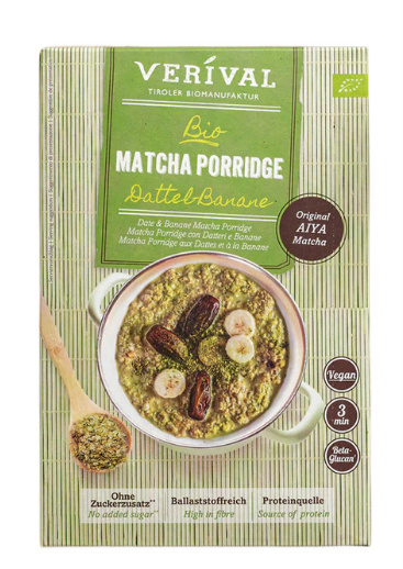 SKŁADNIKIgrubo zmielone płatki OWSIANE pełnoziarniste* 61,7 %, kaszka z PSZENICY ORKISZ pełnoziarnista*, liofilizowane kawałki banana* 4 %, siekane daktyle* 4 % (daktyle* 97 %, mąka ryżowa*), chia* - nasiona szałwii hiszpańskiej (Salvia hispanica), proszek daktylowy* 1,8 %, proszek matcha* 1,5 %. (*certyfikowany składnik ekologiczny)