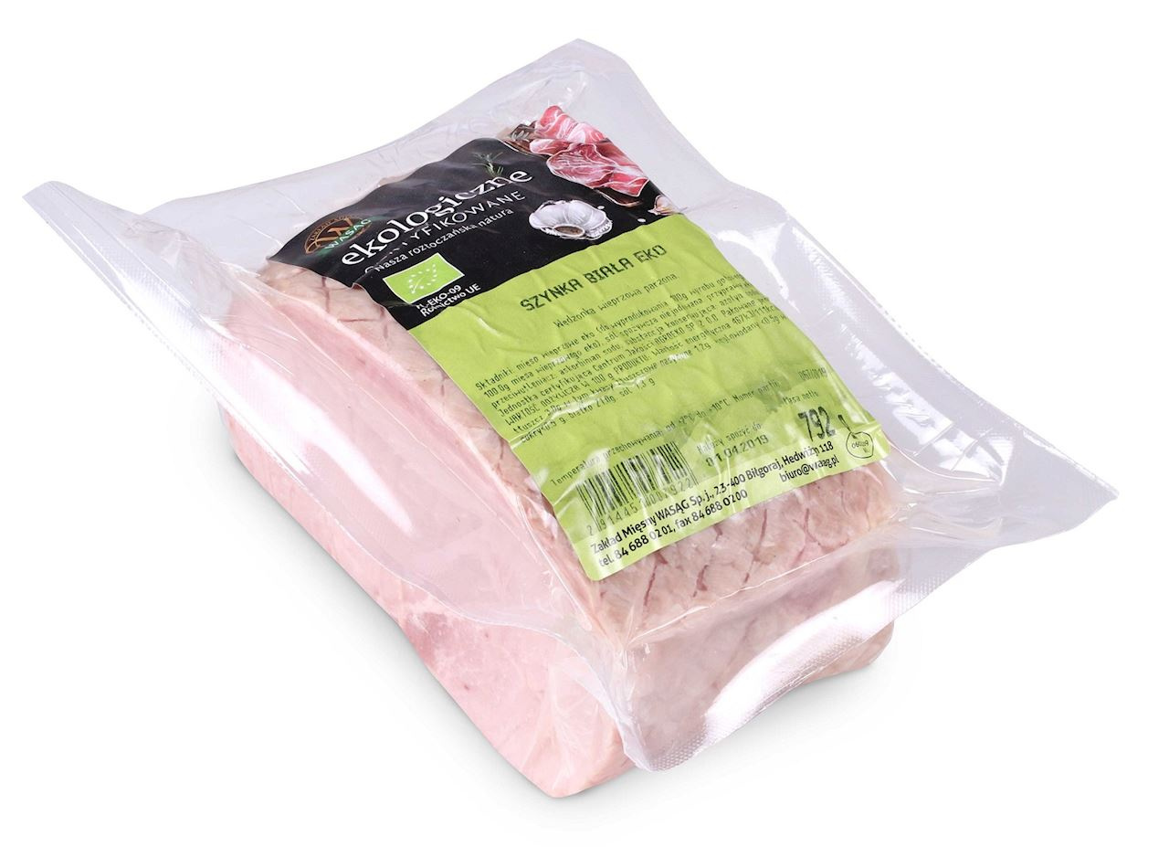 - Ekologiczna szynka biała, tradycyjnie marynowana, bez osłonki, idealna na kanapki i przekąski.