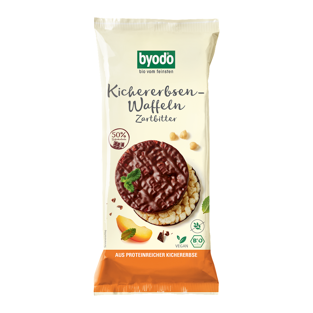 SKŁADNIKIwafle z ciecierzycy* 50 % (mąka z ciecierzycy* (60 %), mąka ryżowa*, sól morska (0,5 %)), czekolada gorzka* 50 % (miazga kakaowa*, cukier trzcinowy*, tłuszcz kakaowy*, wanilia*) (*certyfikowany składnik ekologiczny)